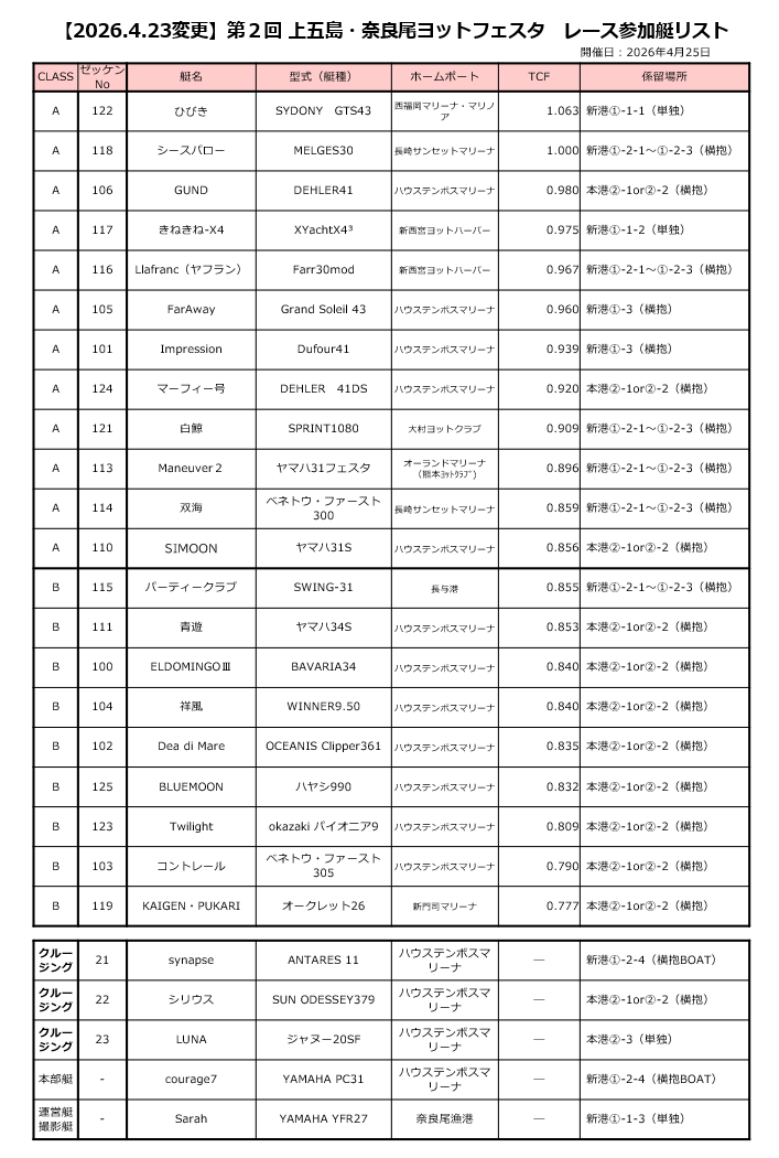 【2026.4.23変更・参加艇リスト・係留場所】第2回奈良尾ヨットフェスタ2026 2026.04.23 上五島奈良尾ヨットフェス , ヨットレース 2026年4月23日、以下の参加艇を1艇変更します。・エンジントラブルにより参加艇「WINDWORD3」(Bクラス・ゼッケンNO.118)を「シースパロー」(Aクラス・ゼッケンNO.118)に変更